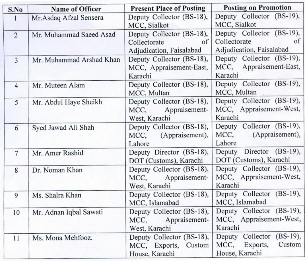 ISLAMABAD: Eleven Pakistan Customs Service officers have been promoted to BS-19 on temporary basis against DTL vacancies in their Service subject to reversion to lower posts upon joining of original incumbents of the posts with immediate effect.