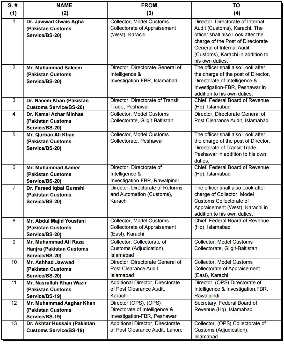 ISLAMABAD: Federal Board of Revenue has transferred/posted 13 Pakistan Customs Service officers BS-19-20) are made with immediate effect and until further orders.