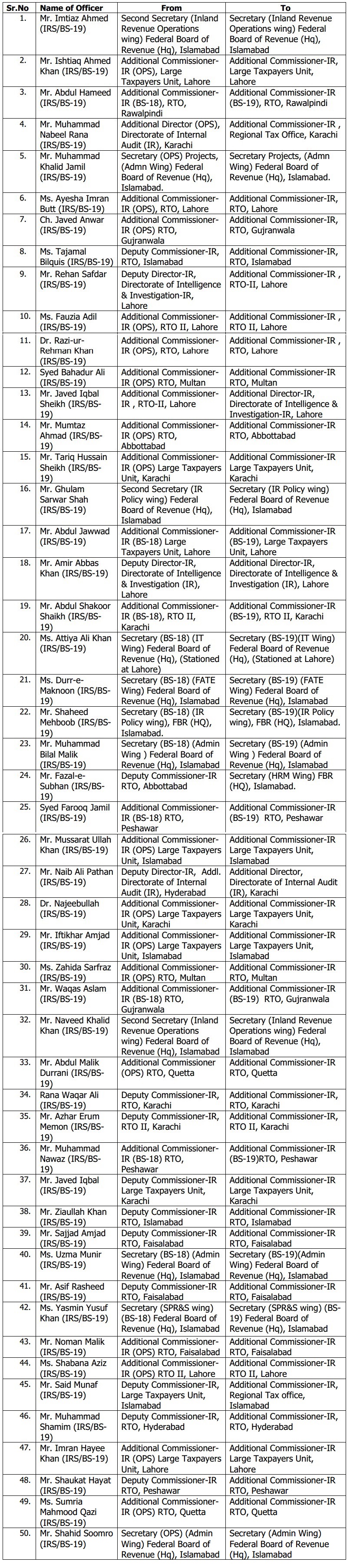 ISLAMABAD: Federal Board of Revenue (FBR) has transferred/posted 50 officers of Inland Revenue Service (BS-19) with immediate.