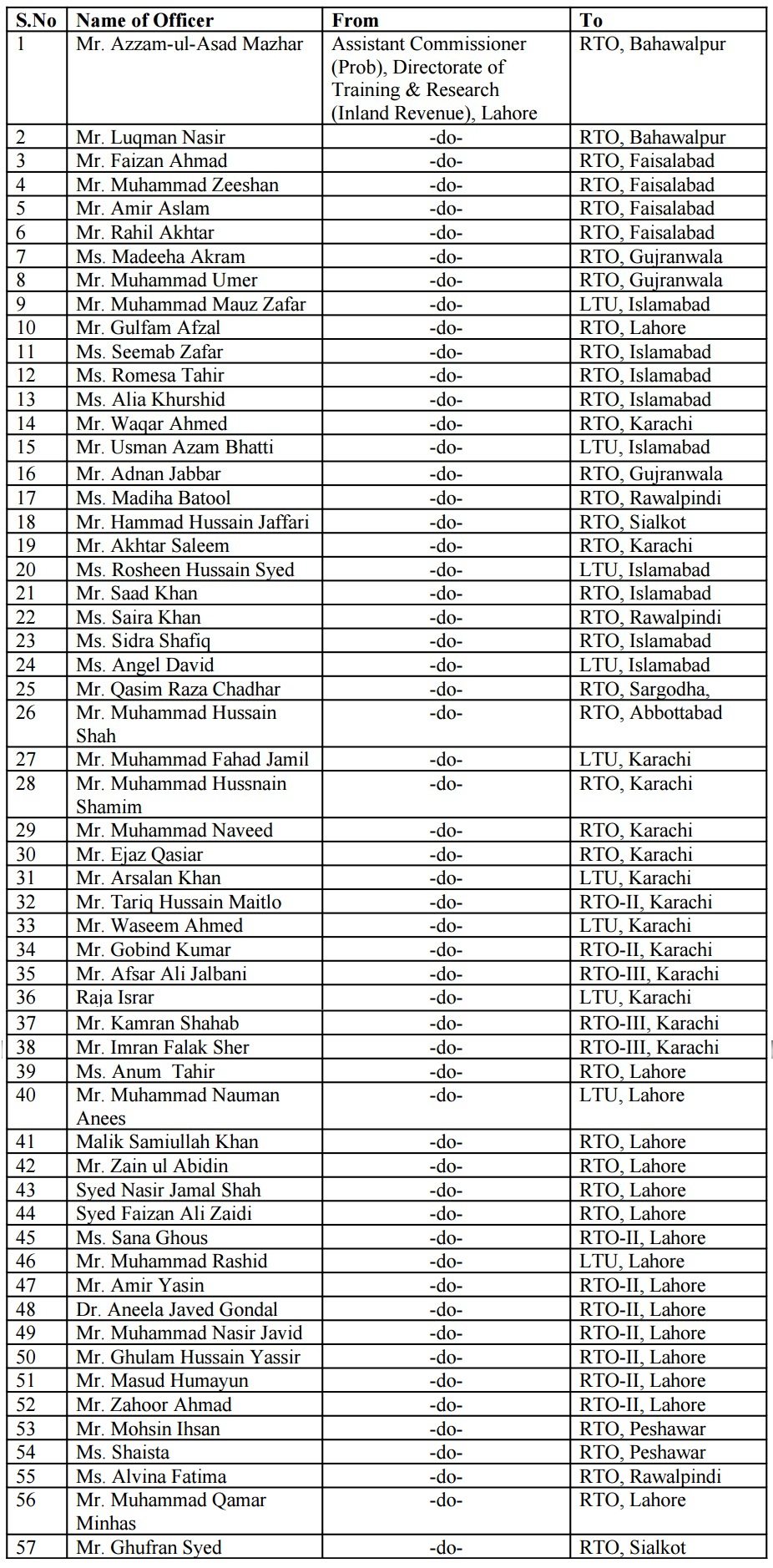 ISLAMABAD: Federal Board of Revenue has transferred/posted 57 Inland Revenue Service officers of BS-17 with immediate effect.