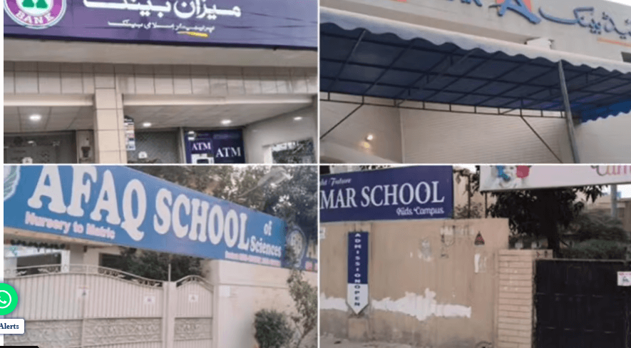 The sealed premises include Allied Bank, Meezan Bank, American Lyceum, Afaq School, APS Secondary School, The Merit School, Paradise Academy & School, Huda Foundation, D Mart, Discount Store, pharmacy, beauty salon, grocery stores, food outlets, auto workshops, offices, and other businesses.