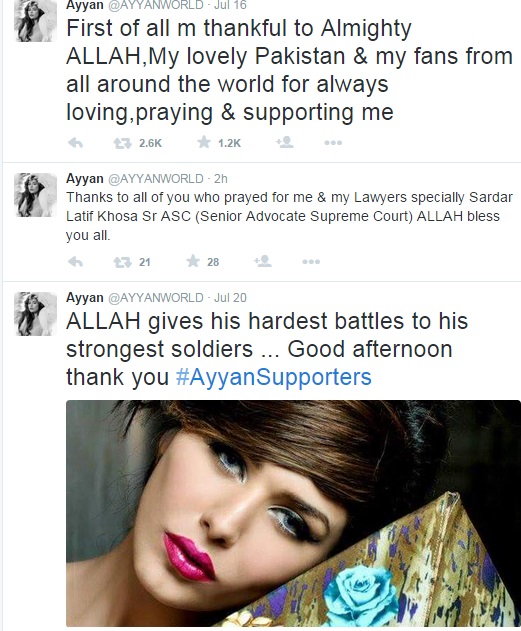 LAHORE: Supermodel Ayyan Ali, who was in hot water due to the charges of currency smuggling, appeared on the social media after getting bail and thanked Allah and her friends for supporting her.
