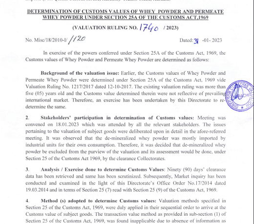 Customs Values of Whey Powder & Permeate Whey Powder revised vide VR No 1740/2023
