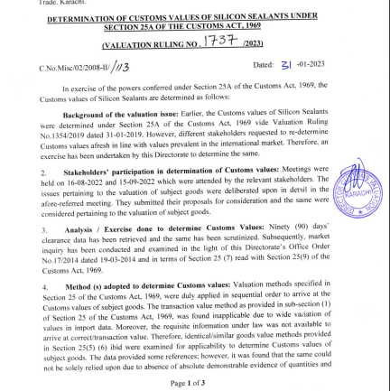 KARACHI: Directorate-General Customs Valuation Director Fayyaz Rasool Maken has determined customs values of Silicon Sealants under Section 25-A of the Customs Act, 1969.
