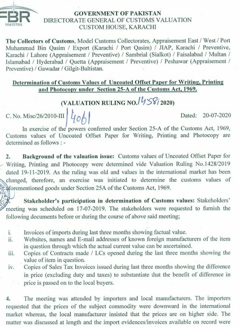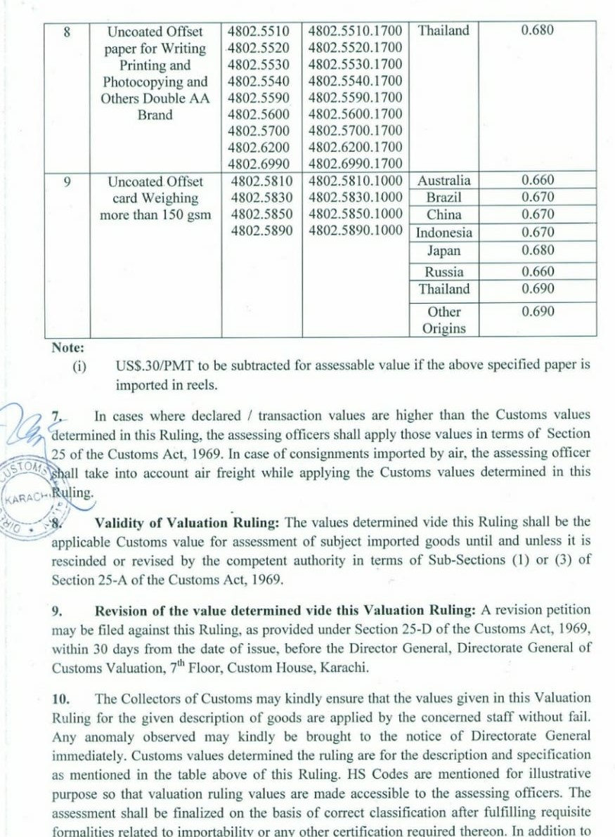 KARACHI: Directorate-General of Customs Valuation Director Shafiq Ahmad Latki has issued customs values of uncoated offset paper for writing, printing and photocopy. As the ruling was old and values in the international market has been changed, therefore, an exercise was initiated to determined the customs values of aforementioned goods under section 25-A, of the Customs Act, 1969.
