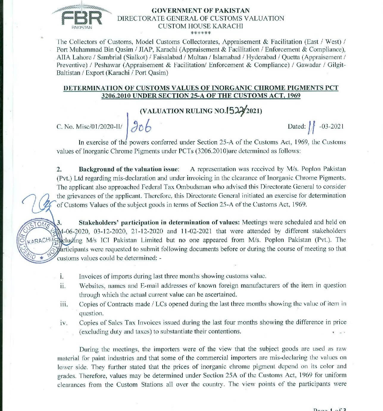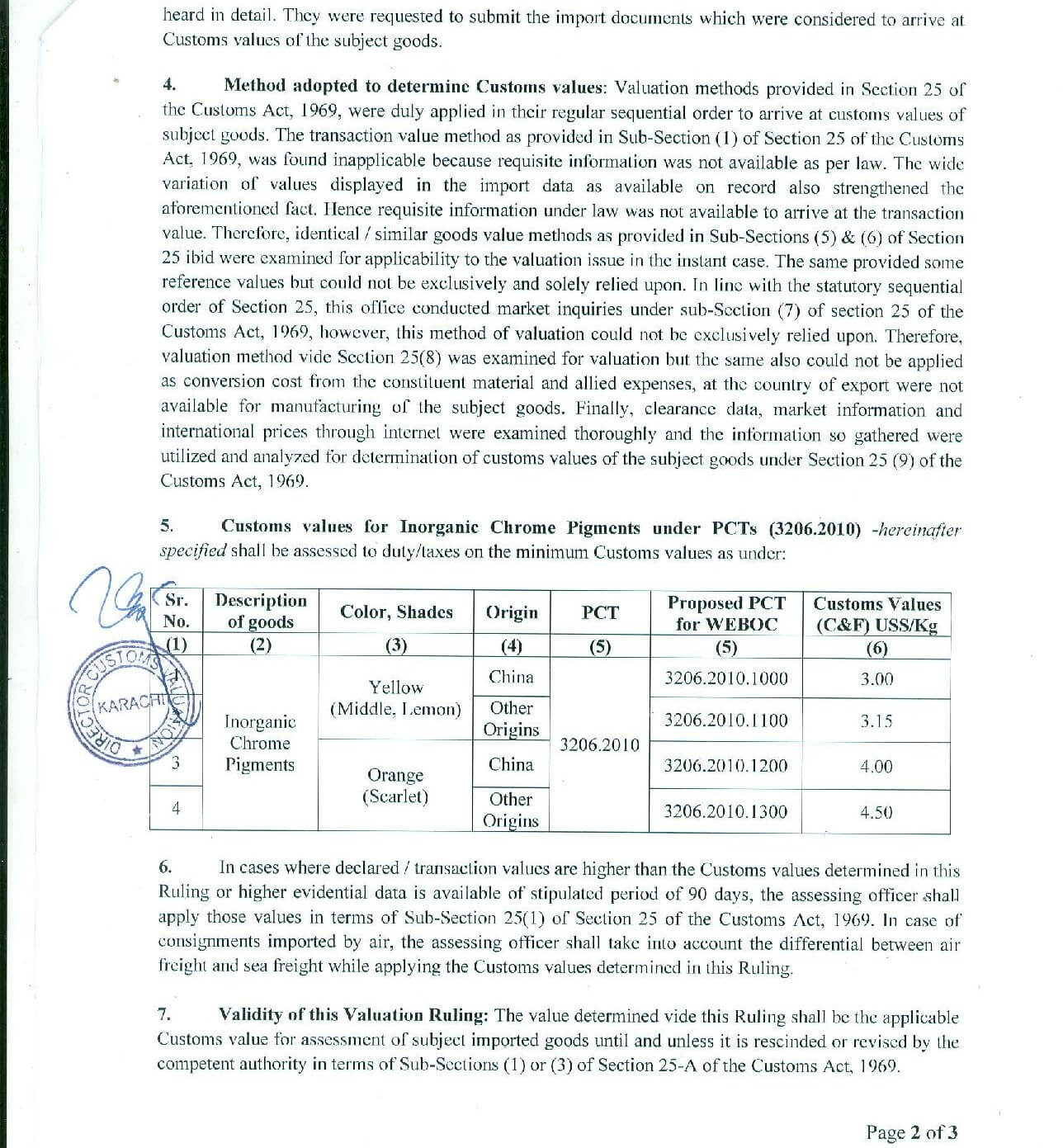 KARACHI: Directorate-General Customs Valuation Director Shafiq Ahmad Latki has revised customs values of Inorganic Chrome Pigments PCT 3206.2010 are determined as follows.