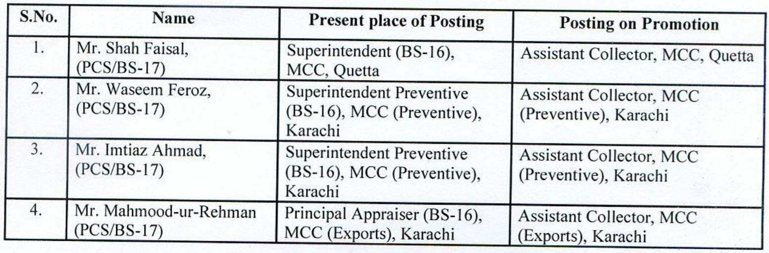 ISLAMABAD: Four Customs Superintendents/Superintendents Preventive/ Principal Appraisers, who were promoted to BS-17 in Pakistan Customs Service vide Board’s Notification No 1624-C-III/2015 dated 30.07.2015, have been transferred and posted as Assistant Collectors in different cities with immediate effect.