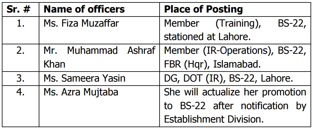 ISLAMABAD: Four Inland Revenue Service officers have been promoted to BS-22 in the same service and posted as shown against each with immediate effect.