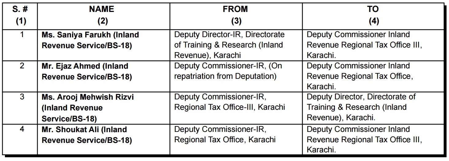 ISLAMABAD: Federal Board of Revenue (FBR) has transferred/posted the four Inland Revenue Service officers of BS-18 with immediate effect.