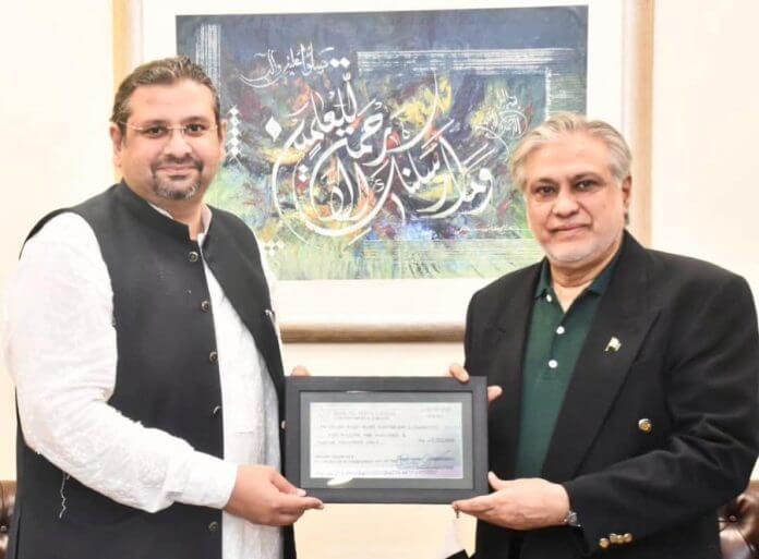 He presented the chaque to Federal Minister for Finance and Revenue, Senator Mohammad Ishaq Dar during a call on meeting with the minister, according tweet by finance ministry.