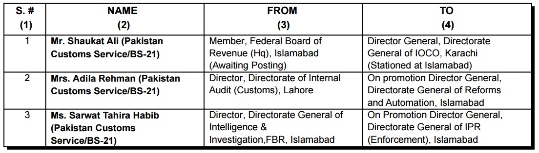 ISLAMABAD: Federal Board of Revenue (FBR) has transferred/posted three Pakistan Customs Service officers of BS-21 with immediate effect.