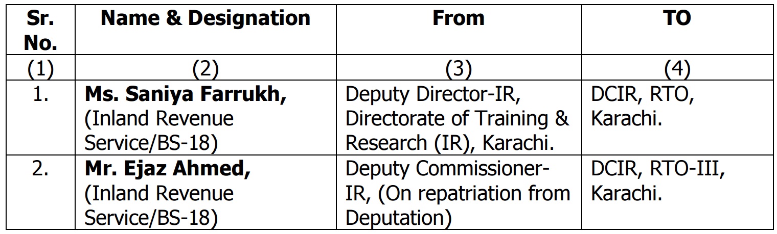 ISLAMABAD: Federal Board of Revenue, with the partial modification in the Notification No.2434-IRI/2015, has transferred/posted in respect of the following officers are made as under: